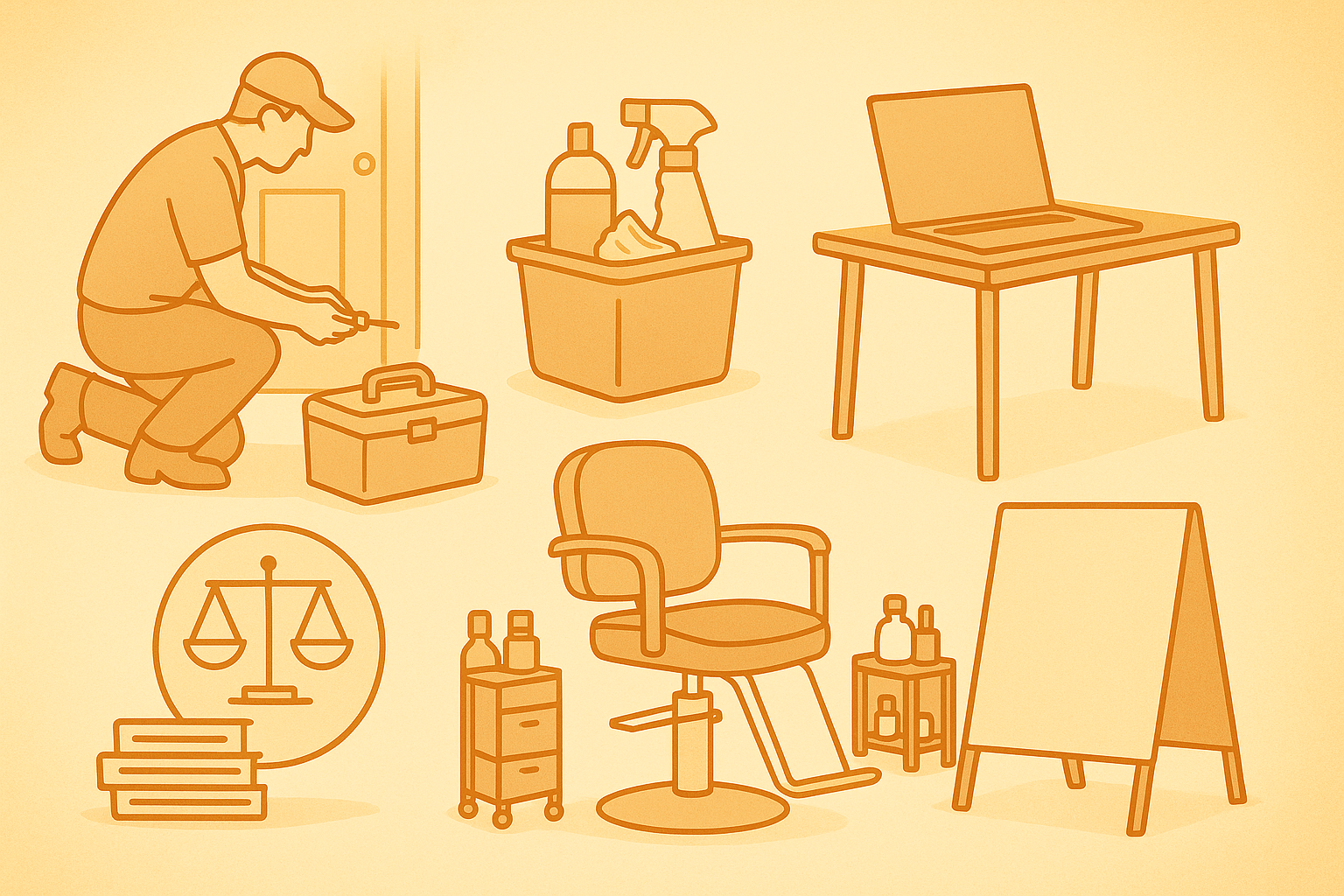 Flat-style saffron-toned illustration showing symbolic icons of neighborhood services: a handyman kneeling with toolbox, a cleaning caddy, a laptop on a table, a salon chair with beauty cart and bottles, a legal scales icon with books, and a blank sandwich-board sign, all on a soft warm background.