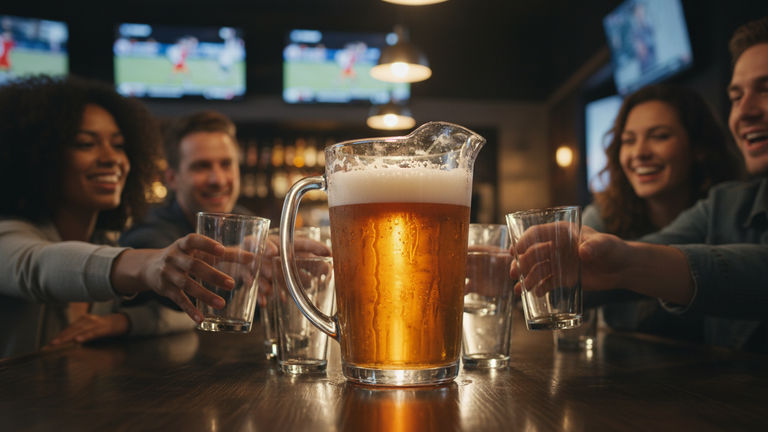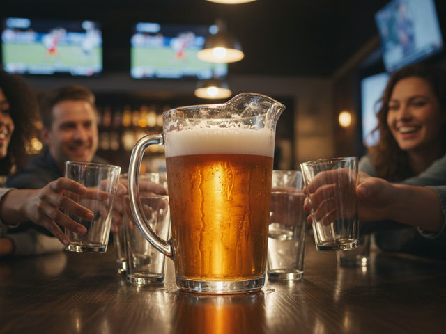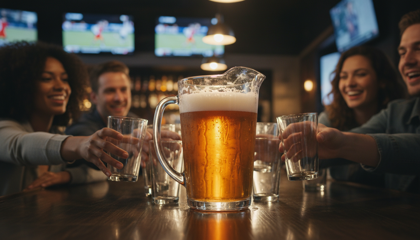 "prompt": "Vibrant photorealistic commercial scene of a large, glistening glass pitcher filled with golden beer, condensation dripping down its side, sitting on a polished wooden bar top. In the softly blurred background, a modern and lively sports bar has warm ambient lighting and screens showing generic, unidentifiable sports action. The hands of a diverse group of friends are reaching for glasses, conveying a fun, social, and energetic atmosphere. The lighting is warm and dramatic, highlighting the crisp, appetizing look of the beverage. no logos, no text, no watermarks, no branded characters",